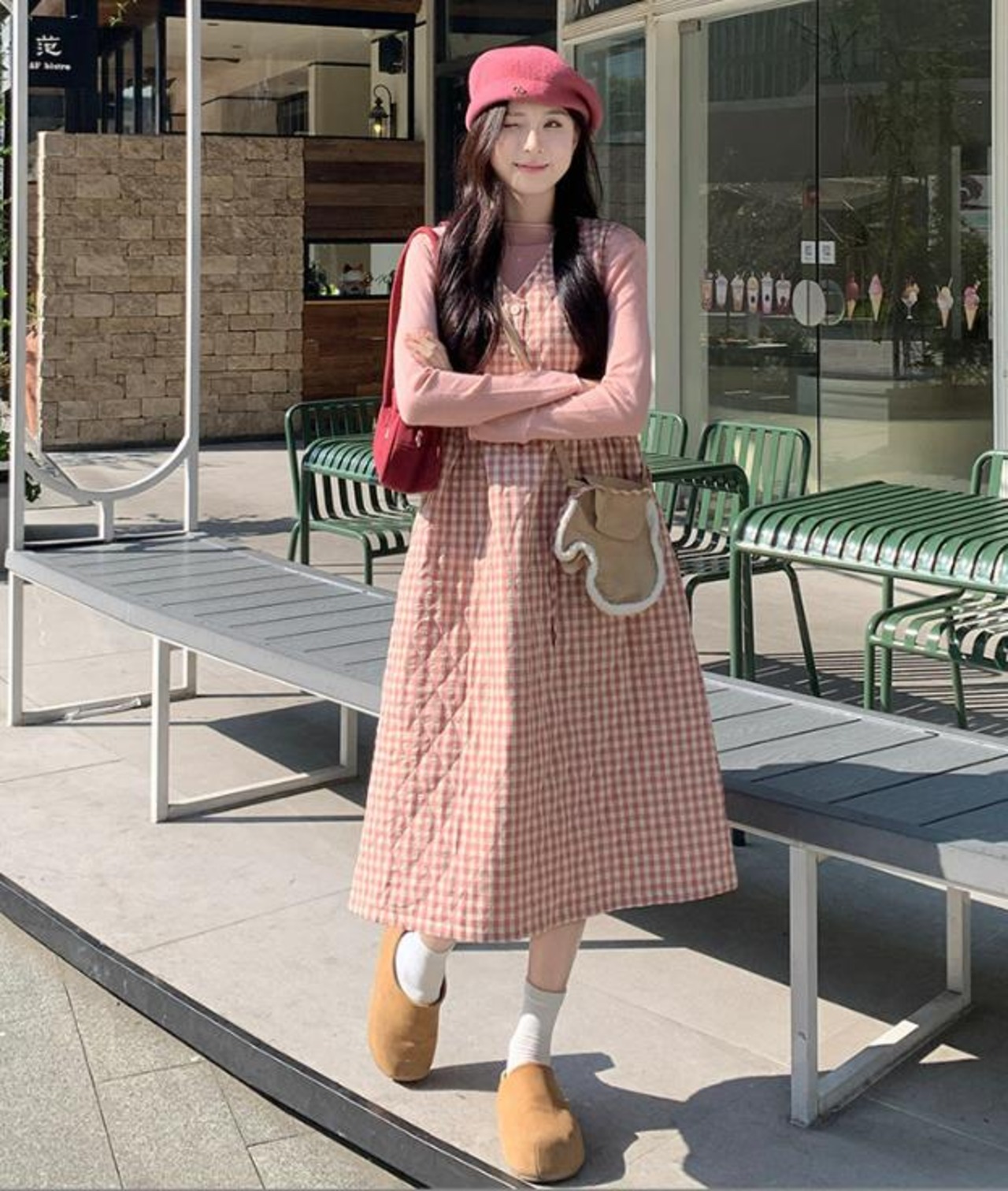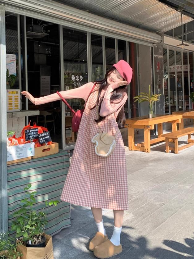 秋冬新作 女 レディース ハイウエスト 袖なしchic チェック柄 ロング ワンピース 台型スカート セット