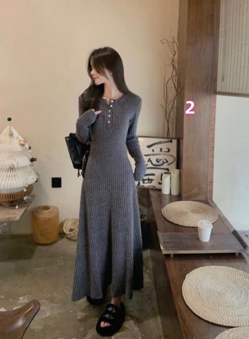2024春秋新作 女 レディースハイウエスト 長袖 ニット ロング ワンピース 台型スカート