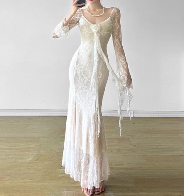 2024春秋新作 女 レディースハイウエスト 長袖 レース ロング ワンピース マーメイドスカート