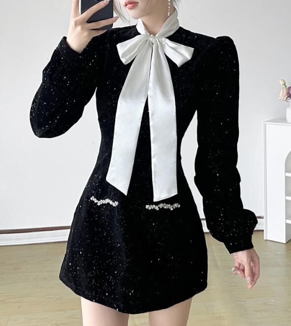 2024秋冬新作 女 レディース ハイウエスト 長袖 ベロア ミニ ワンピース ドレス 台型スカート