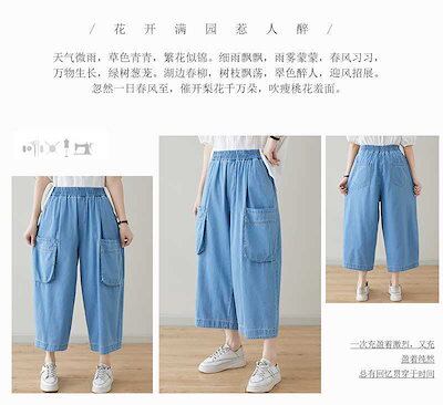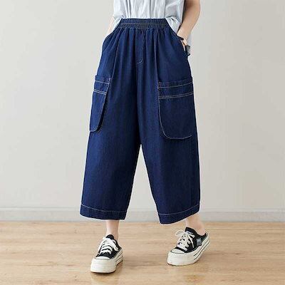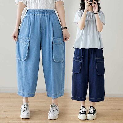 「ファットガール」 九分丈 デニムパンツ ワイドパンツ ジーンズ ポケット付き 夏 ゴム 体型カバー 大きいサイズ ゆったり レディース