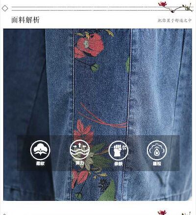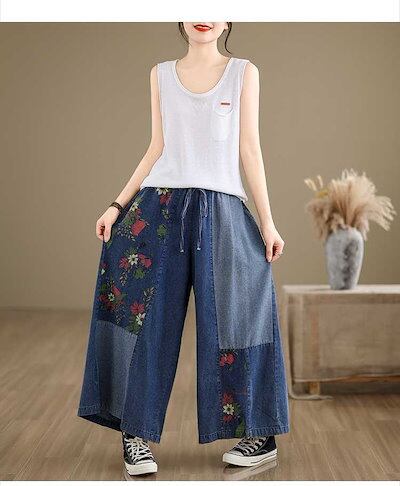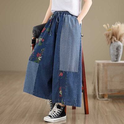 「ファットガール」 夏 デニム ワイドパンツ 刺繍 レトロ 薄手 ドッキング ワイドパンツ 体型カバー 大きいサイズ ゆったり レディース