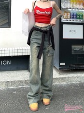 パンツ デニム ジーンズ ワイド ストレート ハイウエスト 脚長効果 美脚効果 細見え ウォッシュ加工 フリンジ 春 カジュアル 韓国ファッション レディース お出かけ