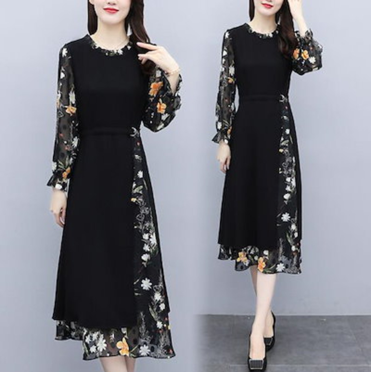 ワンピース レディース レディース ロングワンピース ロング 膝丈 きれいめ Aライン 花柄 切り替え 黒 春 春夏 夏 秋 秋冬 長袖 大きいサイズ カジュアル フォー