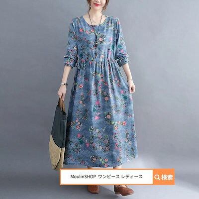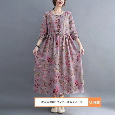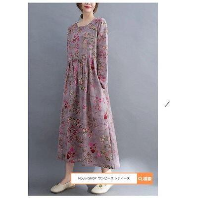 長袖 ワンピース レディース レディース ロングワンピース マキシワンピース 花柄 プリント ロング マキシ丈 コットン リネン 綿麻 きれいめ Aライン フレア