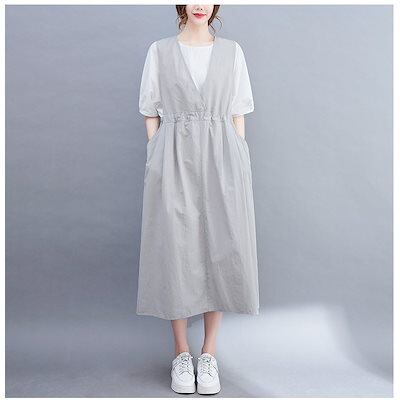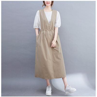 ワンピース オールインワン aラインワンピース 無地 サロペット ロングワンピース ウエストリボン 可愛い 通学 レディース シンプル 20代 30代 40代 綿混