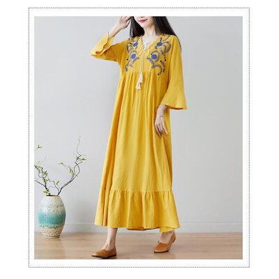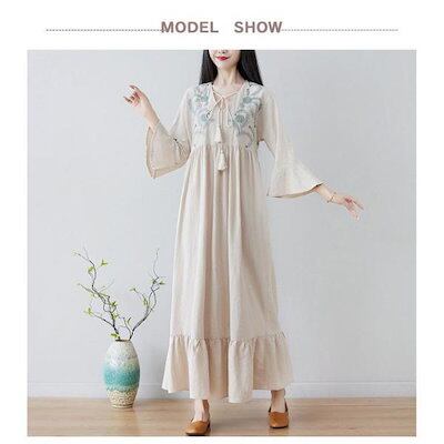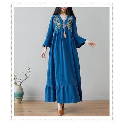 人気商品超目玉 ワンピース ロングワンピース レディース チュニック マキシワンピース 刺繍 長袖 ロング 大きいサイズ 体型カバー 春 秋 Vネック フレア Aライン 綿麻 民族風 | OPEN-korea