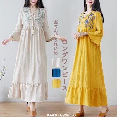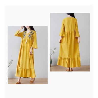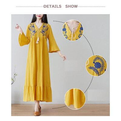 高級な質感 ワンピース ロングワンピース レディース チュニック マキシワンピース 刺繍 長袖 ロング 大きいサイズ 体型カバー 春 秋 Vネック フレア Aライン 綿麻 民族風 | OPEN-korea