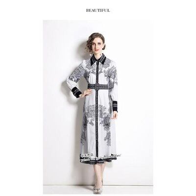 大人の魅力 春 パーティードレス Aラインワンピース レディース シャツワンピース 長袖 ミモレワンピース 着痩せ 気質 おしゃれ プリント柄 お呼ばれ キレイめ
