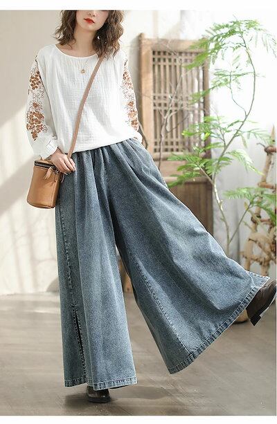 ワイドパンツ デニム デニムパンツ レディース サイドスリット パンツ ボトムス ズボン 長ズボン ロングパンツ ロング丈 ウエストゴム 大きいサイズ ゆったり ワイドデニム ジーンズ おしゃれ 春 | OPEN-korea
