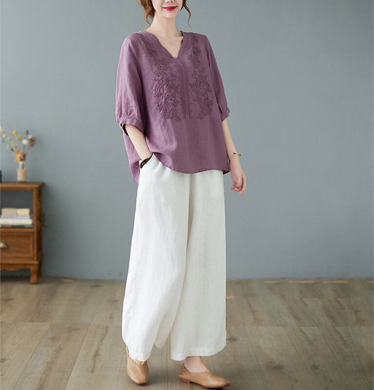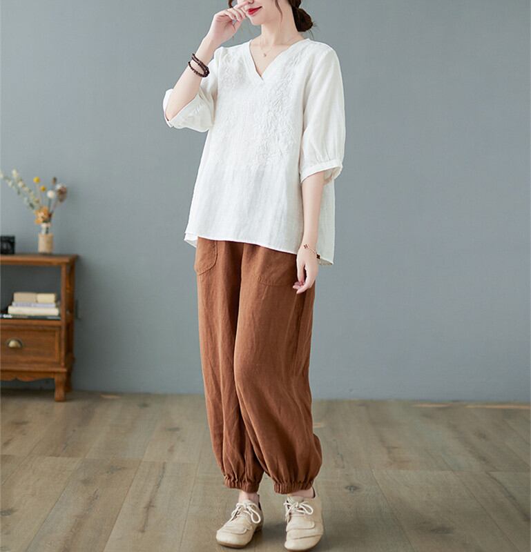 【2022新作】春夏花柄刺繍トップス半袖シャツカジュアル麻綿