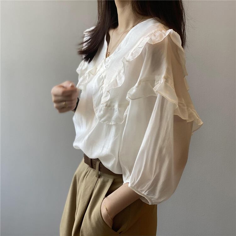 今シーズン大注目 大人気 薄い トップス 半袖 Vネック フリル ブラウス 2022年夏 新しい
