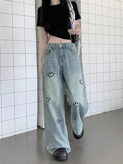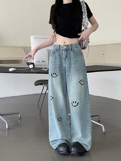 ジーンズ 脚長効果 韓国ファッション 夏 おしゃれ デニム ワイド ニコちゃん 水色 春夏パンツ 細見え スマイル かわいい ハイウエスト レディース 2024 美脚効果 ロング丈 お出かけ | OPEN-korea