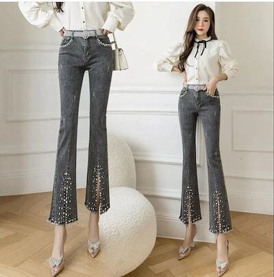 おしゃれ 可愛い デニムパンツ ワイドパンツ 九分ズボン パールビーズ サイドポケット レディース
