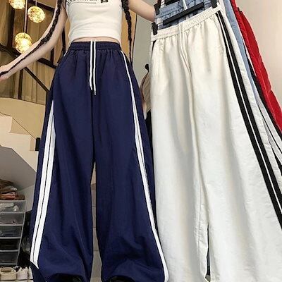 2025 春夏パンツ ロング丈 ウエストゴム ストライプ ワイド ストレート ハイウエスト 美脚効果 脚長効果 細見え 夏 白 黒 赤 おしゃれ かわいい 韓国ファッション レディース お出かけ30% | OPEN-korea