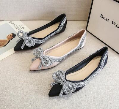 リボン付きパンプス 痛くない オフィス ローヒール ぺたんこ バレエシューズ キラキラ リボン付き フラットパンプス ポインテッドトゥ とんがり 走れる ぺたんこ クッション入り フラットシューズ 通 | OPEN-korea
