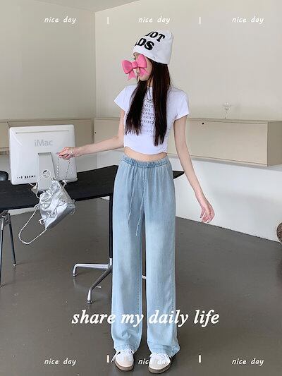 パンツ ワイドパンツ レディース デニムパンツ 夏 薄手 イージーワイドパンツ ボトムス リラックス カジュアル ゆったり 美脚 シンプル ハイウエスト ウエストゴム 通勤 体型カバー 着?せる ファ | OPEN-korea