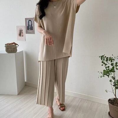 日韓 chic 薄手 快適 丸ネック アイスシルク ニット トップス ワイドパンツ セットアップ 伸縮性のあるウエスト レディース きれいめ 二点セット ルームウェア チュニック 韓国ファッション涼し | OPEN-korea