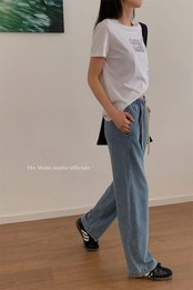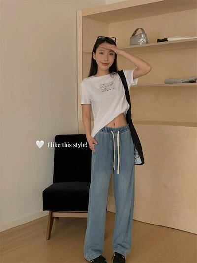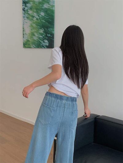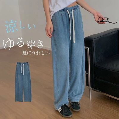 ワイドパンツ デニム レディース パンツ 涼しい 夏 ひんやり 接触冷感 ズボン ロング ウエストゴム ガウチョ 薄手 大人 きれいめ ボトムス 楽ちん ゆったり カジュアル お洒落 無地 着痩せ | OPEN-korea