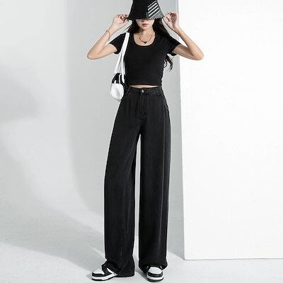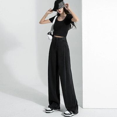 ワイドパンツ ロングズボン 長ズボン ハイウェストゆったり デザイン感 レディース服 ロングパンツ ジーンズ 着痩せ モップパンツ 夏 ブラック レディース ワイドパンツ ジーンズ デニムボトムス | OPEN-korea