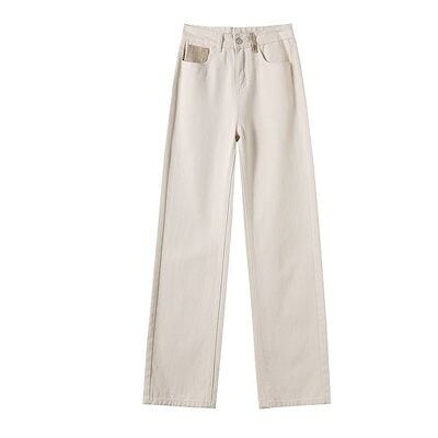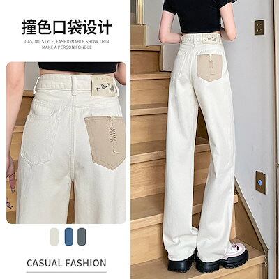 デニムパンツ 美脚 レディース ボトムス インパクトカラーワイドパンツ 米白デザイン感 ハイウエスト 2025春秋 ストレート ジーンズ デニムボトムス