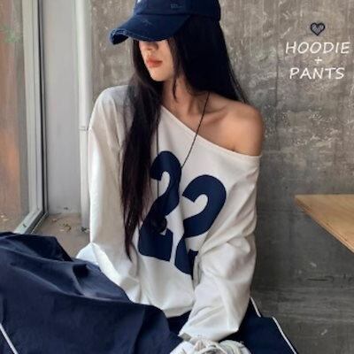 2024 夏トップス スウェット 長袖 ワンショルダー 数字 22 肩見せ ゆったり 細見え 夏 ホワイト 白 おしゃれ かわいい 韓国ファッション レディース お出かけ