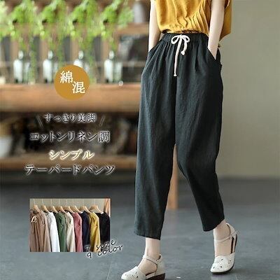 シン カジュアル ゆるめ 9分丈 アンクルパンツ 調整可 紐付き ウェスト総ゴム 着やすい イージーパンツ 無地 九分丈 パンツ テーパード 通気性 美脚 春夏 レディース テーパードパンツ 綿麻調