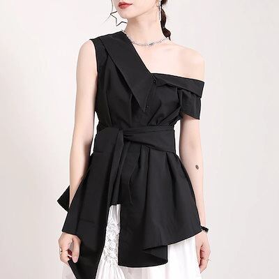 ワンショルダー ブラウス 斜め肩 蝶結びベルト おしゃれ レディース ノースリーブ ブラウス