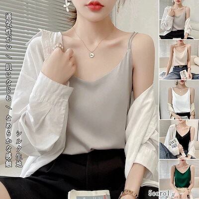 キャミソール タンクトップ 無地 柔かい レディース シルクキャミソール Vネック スリング 新作のノースリーブインナー サテンベース