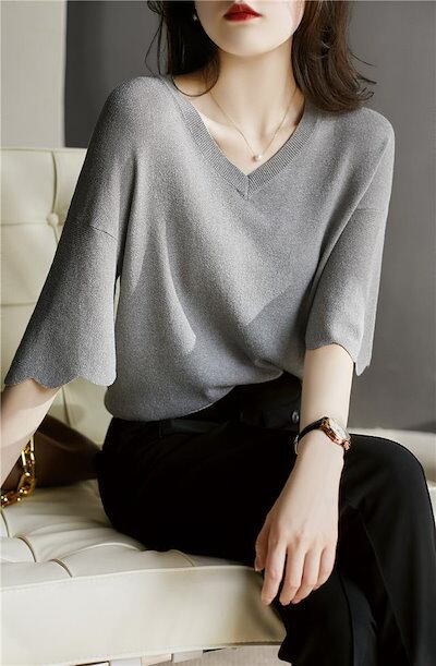 韓国ファッションTシャツ 半袖 レディース ニット 無地 ゆったり 着痩せ シンプル カジュアル 薄手 柔らかいVネック トップス