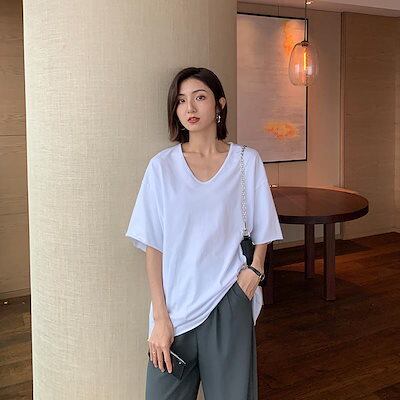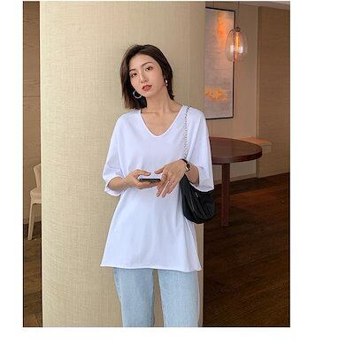 シンプル オーバーサイズ VネックUネックTシャツレディース 半袖 トップス 着痩せ 無地 韓国ファッション 人気 大きいサイズ 上着 ゆったり