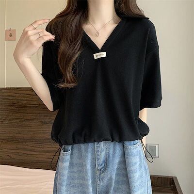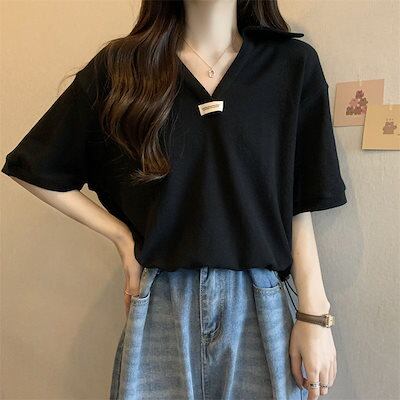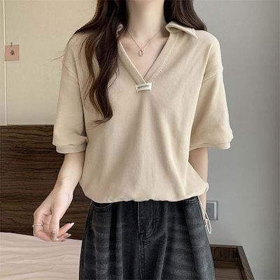 レディース 韓 国ファッション Vネック 無地 半袖 大きいサイズ tシャツ 夏 ポロネックトップス 着痩せ ゆったり シャツ