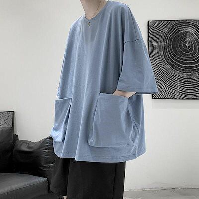無地 大きい ポケット ラウンドネック Tシャツ 夏新作 日系 トレンド メンズレディース ゆったり トップス 半袖