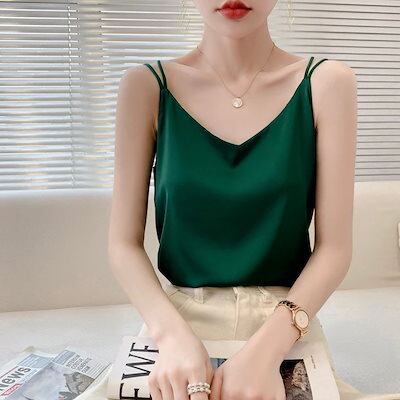キャミソール タンクトップ 無地 柔かい レディース シルクキャミソール Vネック ダブルスリング 新作のノースリーブインナー サテンベース