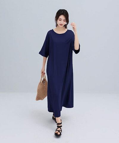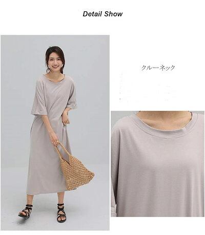 Tシャツロングレディース半袖ロングワンピースクルーネックフレンチスリーブストレッチチュニック大きいサイズ体型カバー無地マキシワンピースゆったり着痩せプルオーバーカジュア