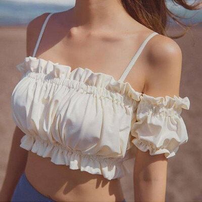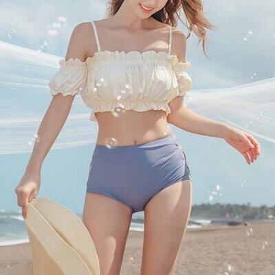 人気商品超目玉 水着 レディース ビキニ ハイウエスト オープンショルダー レースアップ 可愛い 大人 フリル 白 青