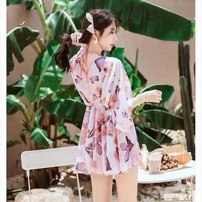 水着レディース2点セットビキニトップススイムウェア個性的ワンピースチュニック七分袖Vネックフリル体型カバー花柄緑MLXL2XL無地夏おしゃれカジュアルフェミニンガーリー大人可愛い海プール羽織