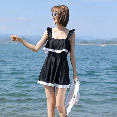 万能流行感 レディース 水着 スイムウエア ワンピース スクエアネック 無地 フリル バイカラー 大人可愛い カジュアル フェミニン 温泉 スパ 海 ビーチ