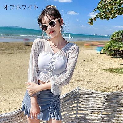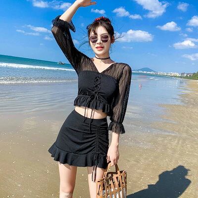 水着 レディース 体型カバー おしゃれ 2点セット フリルビキニ ママ 水泳服 スイムウェア 長袖トップス+スカートつきショーツ 温泉 海水浴 20代30代40代 2色