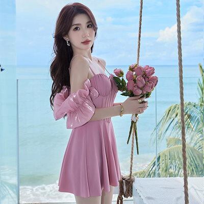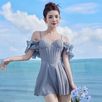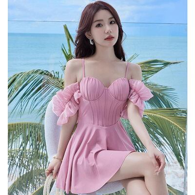 フリル袖 オープンショルダー 体型カバー 大きいサイズ おしゃれ ワンピース 光沢 レディース かわいい オーガンジー オールインワン 水着