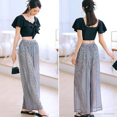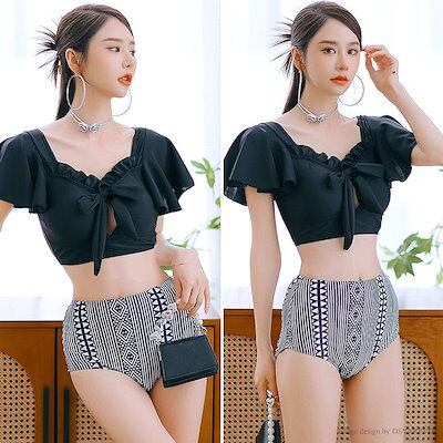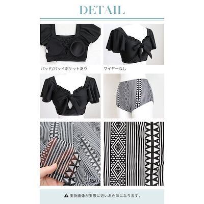 フリル 40代 20代 体型カバー 水着 3点セット チュール 幾何学 ジオメトリー レディース おしゃれ ビキニ 30代 ワイドパンツ 柄 体型カバー水着 ブラック