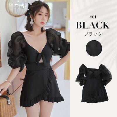 レディース 水着 体型カバー 可愛い フリルワンピース水着 ワンピース エアリースリーブ 袖付き おしゃれ