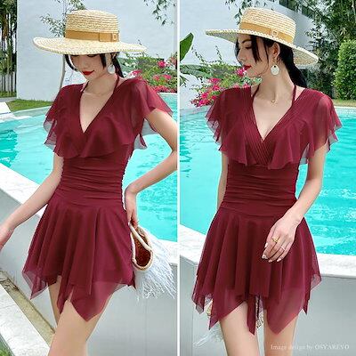 ママ ランダムフリル ダイビングネック 黒 40代 水着 白 ワンピース水着 リゾート水着 レディース ミセス 体型カバー ワイヤー入り ワンピース 赤 30代