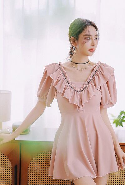 水着 レディース ワンピース 体型カバー水着 大きいサイズ ぽっちゃり かわいい おしゃれ 無地 フリル 袖 ハイウエスト 露出控えめ カットアウト カッティング 二の腕 お尻 太もも お腹 カバーア
