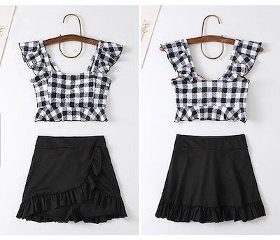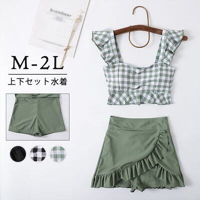 上下セット水着 レディース 韓国 ギンガムチェック柄 フリルショルダー エンジェルスリーブ 水着 ガール 可愛い 痩せ見え 体型カバー ぽっちゃり ビーチ プール 海 水泳 セクシー オトナ女子 かわ