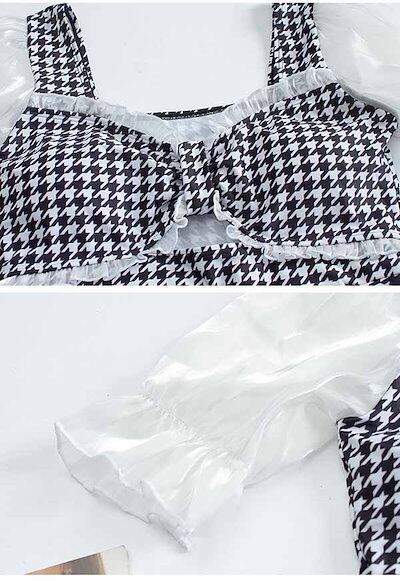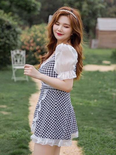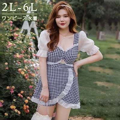 ワンピース水着 体型カバー 千鳥柄 ぽっちゃり 水着 レディース 大きいサイズ 韓国 カットアウト カットアウト 可愛い 袖付き 透け感 フリル 胸開き 痩せ見え ビーチ プール 海 水泳 セクシー