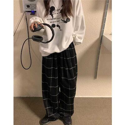 レトロファーファー磨きチェックカジュアルパンツレディース春冬新作厚手ストレートワイドパンツモップパンツ