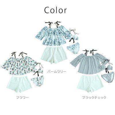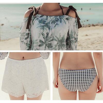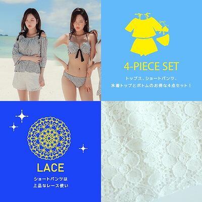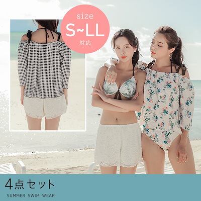 SEA ANGEL【2025新作】体型カバー ママ 水着 4点セット ラッシュガード 長袖 夏 レディース 肩見せ オフショルダー トップス ボトムス ビキニ パッド付 ショートパンツ レース