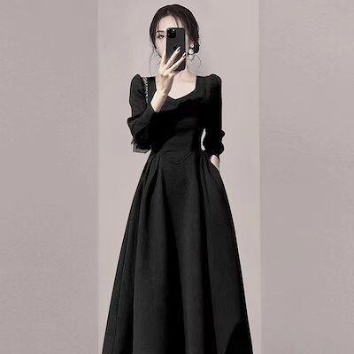 高級感 レトロ ブラック ウエスト引き締めワンピース 秋冬 ニューデザイン フランス スクエアネック ロングスカート ワンピース