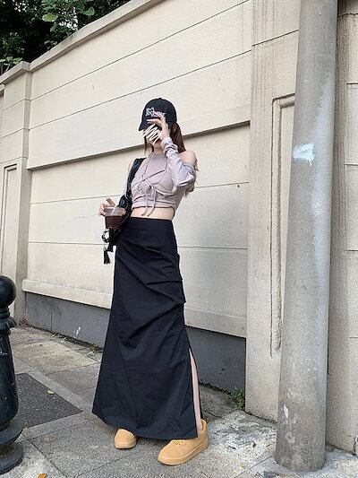 2024 春夏 ロング丈スカート セミ ハイウエスト ロングスカート スタイルアップ カジュアルグレー ブラックフレンチきれいめシズニック